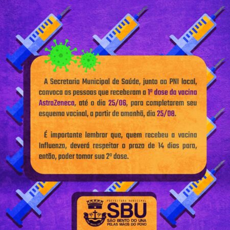 A Secretaria Municipal de Saúde, junto ao PNI local, convoca as pessoas que receberam a 1ª dose da vacina AstraZeneca, até o dia 25/06, para completarem seu esquema vacinal, a partir de amanhã, dia 25/08. É importante lembrar que, quem […]