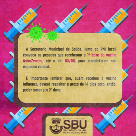 A Secretaria Municipal de Saúde, junto ao PNI local, convoca as pessoas que receberam a 1ª dose da vacina AstraZeneca, até o dia 31/05, para completarem seu esquema vacinal. É importante lembrar que, quem recebeu a vacina Influenza, deverá respeitar […]