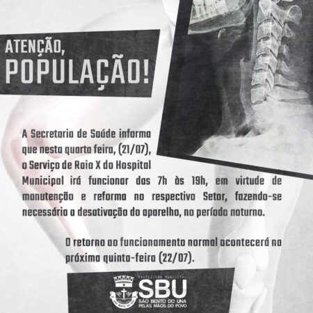 A Secretaria de Saúde informa que hoje (21/07), o Serviço de Raio X do Hospital Municipal irá funcionar das 7h às 19h, em virtude de manutenção e reforma no respectivo Setor, fazendo-se necessária a desativação do aparelho, no período noturno.O […]
