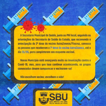 A Secretaria Municipal de Saúde, junto ao PNI local, seguindo as orientações da Secretaria de Saúde do Estado, que recomenda a antecipação da 2ª dose da vacina AstraZeneca/Fiocruz, convoca as pessoas que receberam a 1ª dose da vacina AstraZeneca, até […]