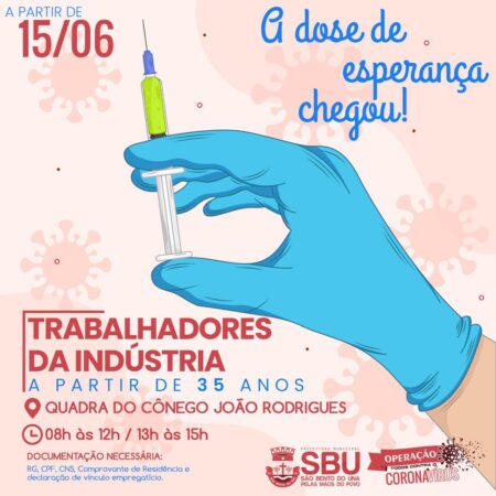 É com imensa felicidade que a Secretaria Municipal de Saúde anuncia que, amanhã (15/06), realizará a imunização contra a Covid-19, levando esperança aos trabalhadores acima de 35 anos de idade, sem comorbidades.Local da vacinação: Quadra Poliesportiva do Cônego João Rodrigues.Horário: […]