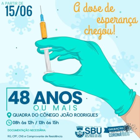 É com imensa alegria que a Secretaria Municipal de Saúde anuncia que, amanhã (15/06), fará nova ampliação da imunização contra a Covid-19, levando esperança às pessoas a partir de 48 anos de idade, sem comorbidades.Local da vacinação: Quadra Poliesportiva do […]