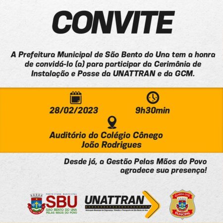 A Prefeitura Municipal de São Bento do Una, tem a honra de convidar toda população são-bentense para participar da Cerimônia de Instalação e Posse da UNATTRAN e da GCM. Data: 28/02/2023 Horário: 9h30min Local: Auditório do Colégio Cônego João Rodrigues. […]