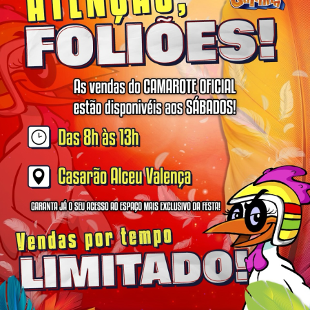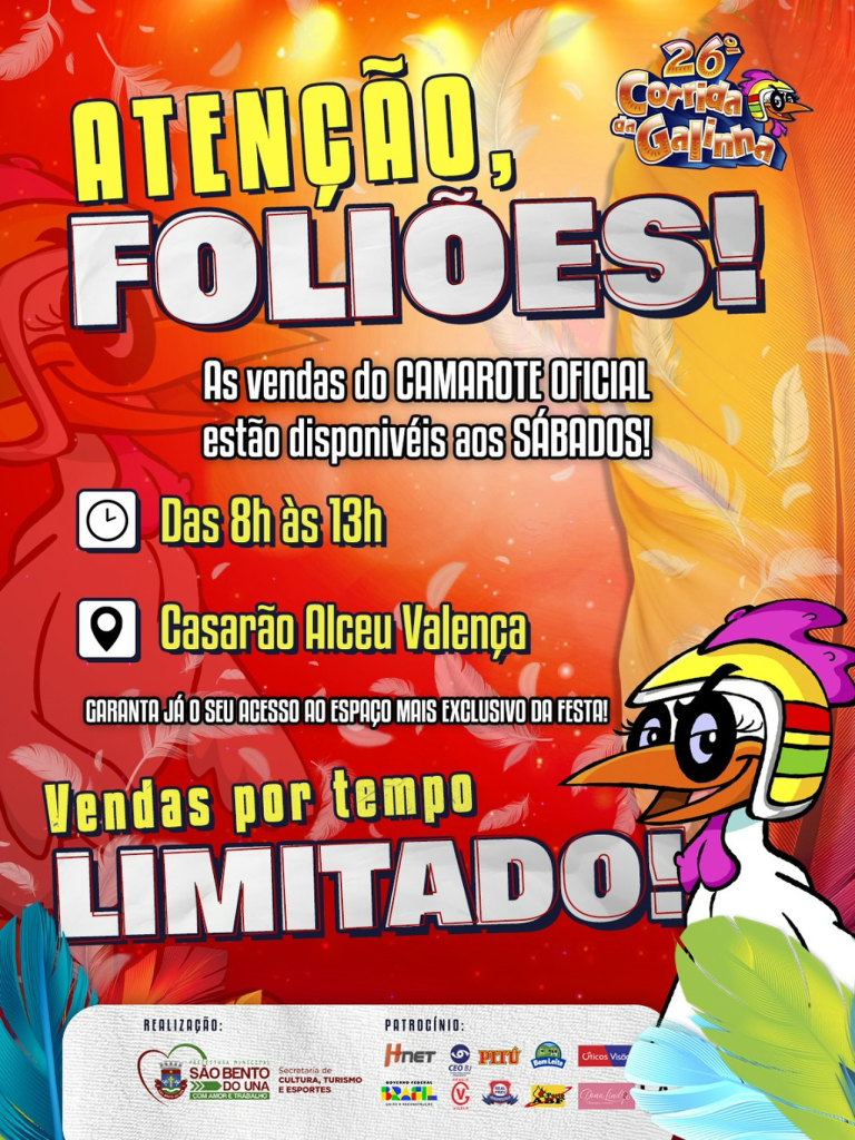 ATENÇÃO, FOLIÃO DE PLANTÃO!!! A 26ª Corrida da Galinha tá batendo na porta e a boa notícia é que as vendas DO CAMAROTE OFICIAL, além de estarem disponíveis de segunda a sexta-feira, na recepção da Sede da Prefeitura, também estarão […]