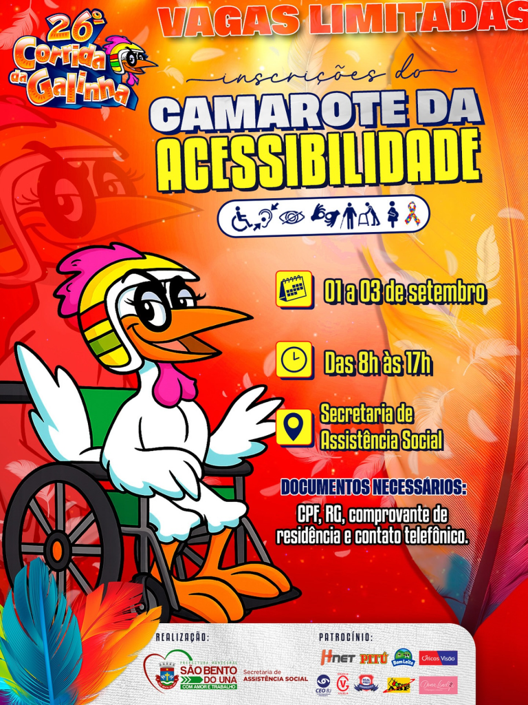 ATENÇÃO, POPULAÇÃO!!! A Prefeitura de São Bento do Una, através da Secretaria Municipal de Assistência Social vem a público divulgar a ABERTURA DAS INSCRIÇÕES PARA O CAMAROTE DA ACESSIBILIDADE NA 26° CORRIDA DA GALINHA, visando assegurar direitos às pessoas com […]
