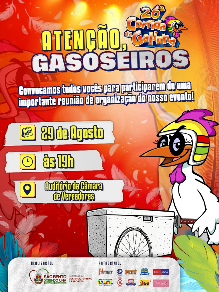 A organização da 26ª Edição da Corrida da Galinha convoca todos vocês para participarem de uma importante reunião que acontecerá no próximo dia 29, a partir das 19h, no Auditório da Câmara de Vereadores. Nesse encontro, serão discutidos detalhes importantes […]