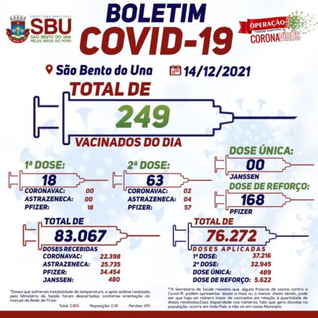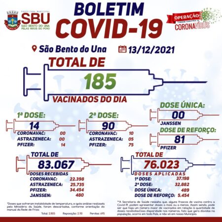 A Prefeitura Municipal de São Bento do Una, por meio do PNI local, comunica que o funcionamento do PONTO DE VACINAÇÃO CONTRA A COVID-19, EXCEPCIONALMENTE NESTE FINAL DE SEMANA (dias 18 e 19/12), mudará de local: a vacinação será ofertada […]
