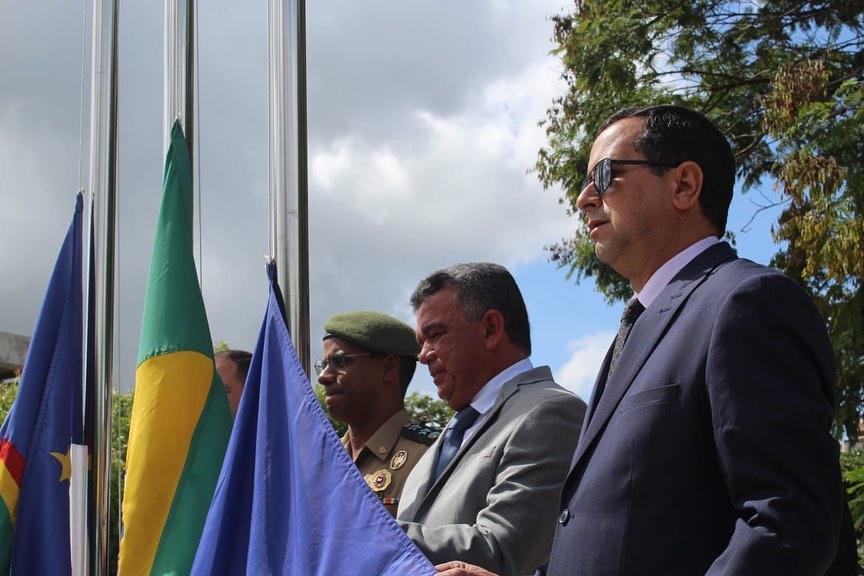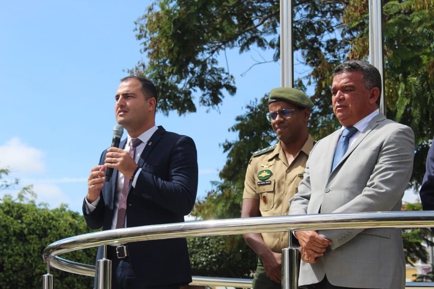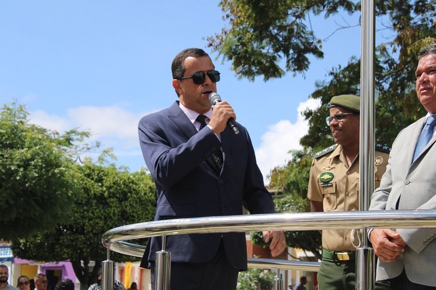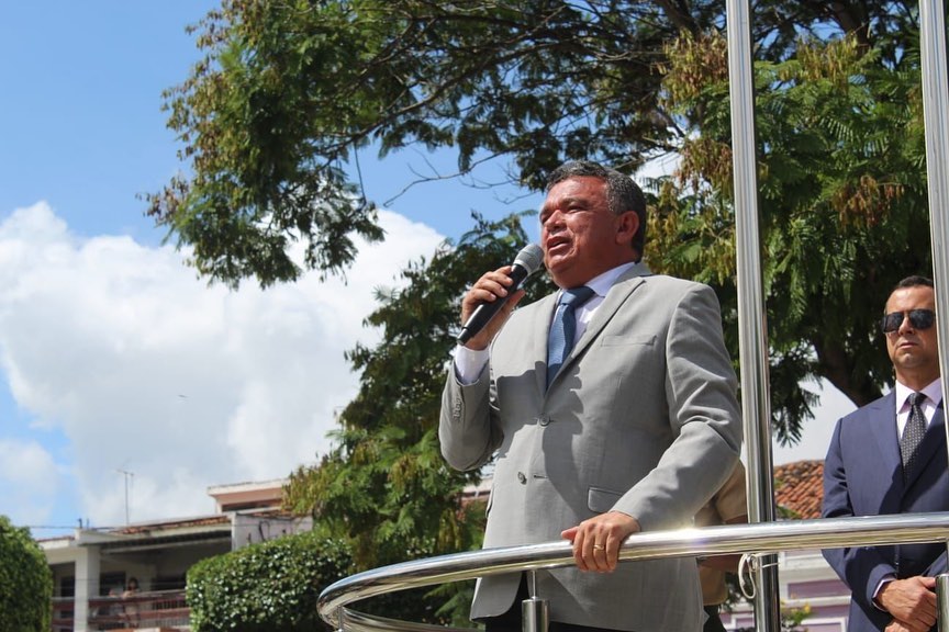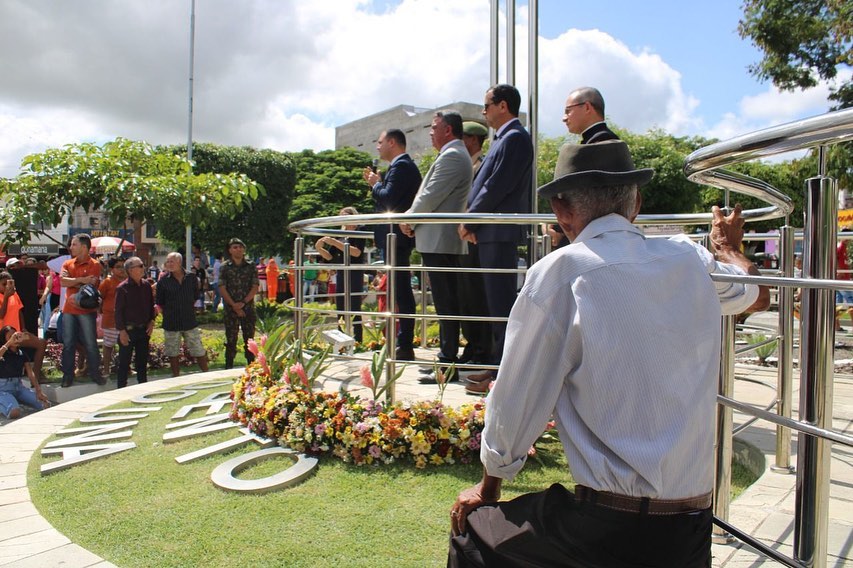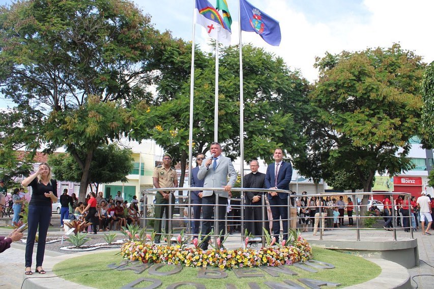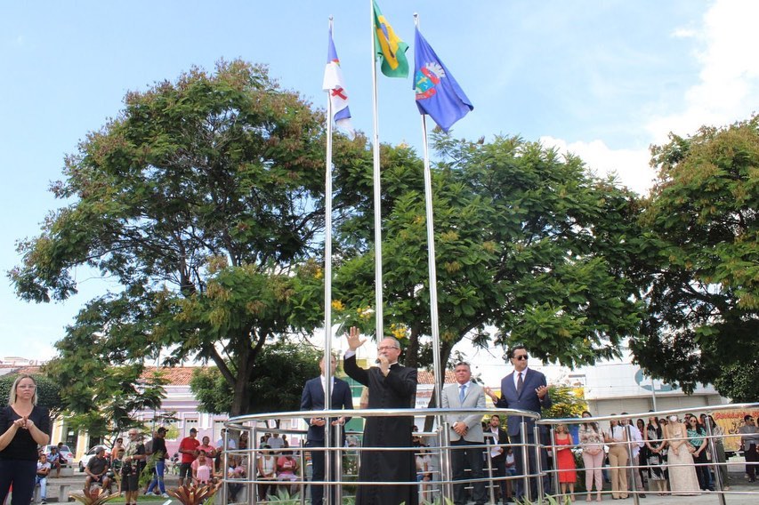 Dentro das solenidades comemorativas desta manhã histórica, em virtude dos 162 Anos de Emancipação Política do nosso Município, estiveram reunidos na Praça Historiador Adalberto Paiva, na frente da Sede da Prefeitura Municipal, o Prefeito do Município, o Vice-prefeito, o Pároco Wellington Vilar, Secretários Municipais e diversas outras autoridades convidadas, em função da cerimônia de hasteamento dos pavilhões Nacional, Estadual e Municipal, cujos hinos foram executados pela centenária Banda Musical Santa Cecília, patrimônio da Terra e orgulho nosso!