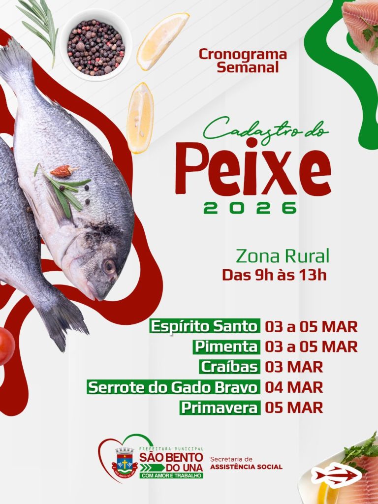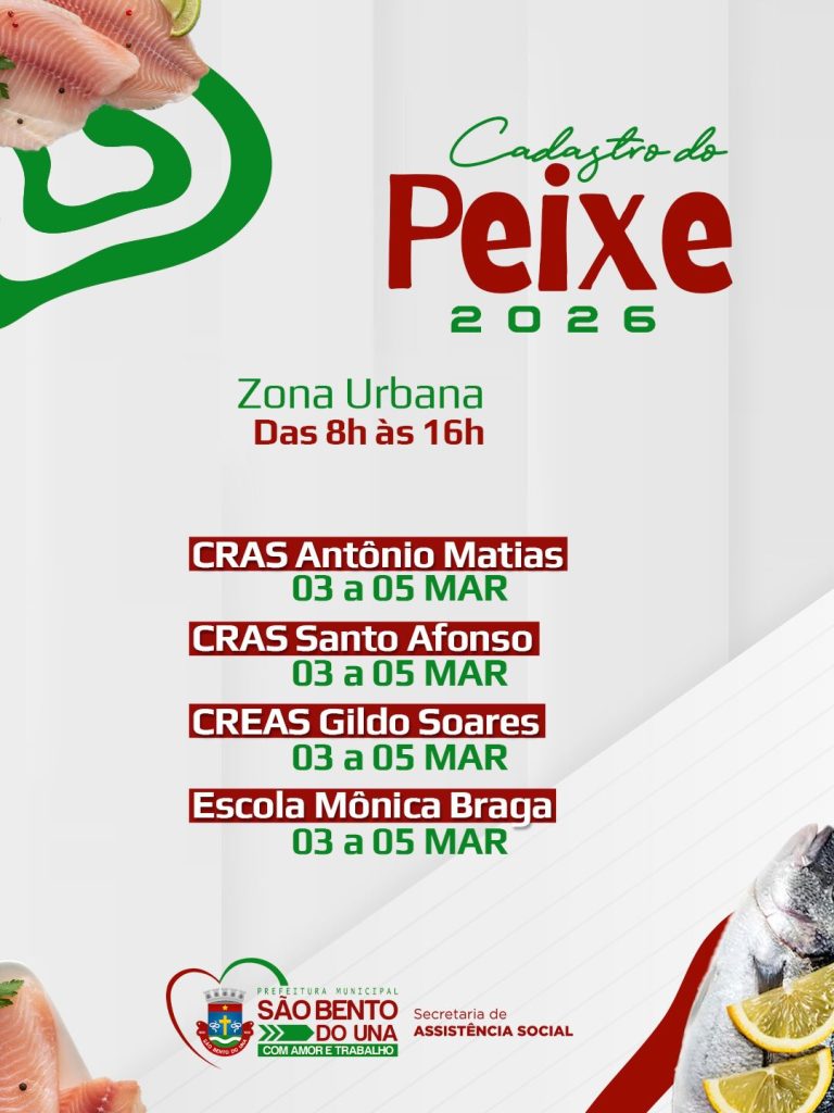 A Prefeitura de São Bento do Una, por meio da Secretaria de Assistência Social, informa que, a partir de amanhã (03 de março), terá início o cadastramento para a Entrega do Peixe da Semana Santa.