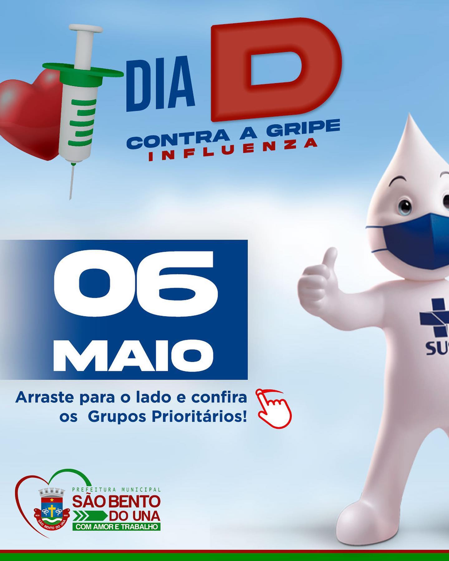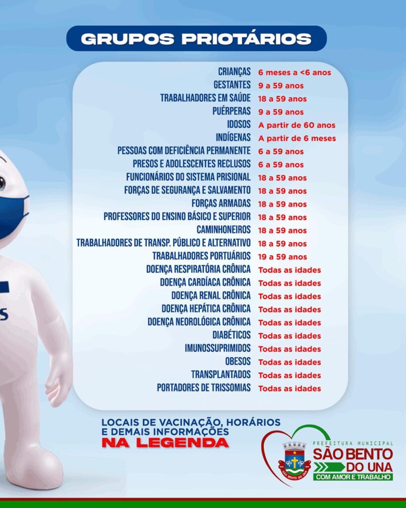 A Prefeitura de São Bento do Una, através da Secretaria de Saúde, e por meio do PNI local, comunica à população são-bentense que NO PRÓXIMO SÁBADO, DIA 06 DE MAIO, SERÁ O “DIA D” DA VACINAÇÃO CONTRA A INFLUENZA PARA TODAS AS PESSOAS QUE FAZEM PARTE DOS GRUPOS PRIORITÁRIOS.