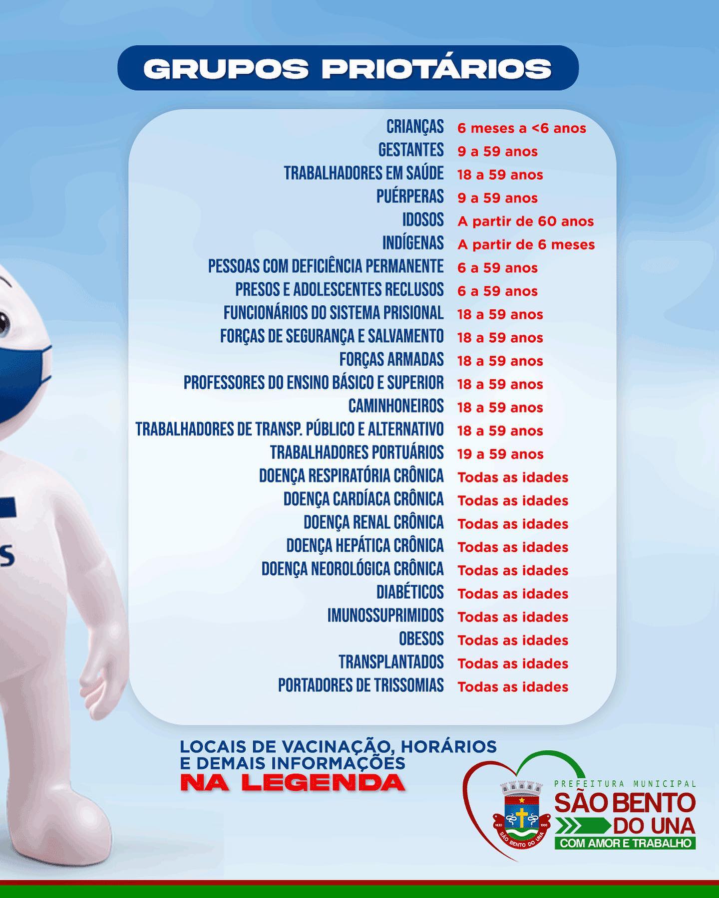 Os “grupos prioritários” definidos pelo MS (Ministério da Saúde) estão especificados nas imagens.