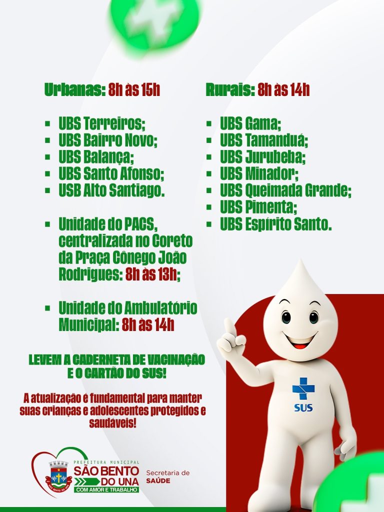 No próximo DIA 18, a Prefeitura de São Bento do Una, através da Secretaria Municipal de Saúde, estará mobilizada no “DIA D” da Campanha Nacional de Multivacinação 2025: uma grande estratégia para atualização da caderneta de vacinação de crianças e adolescentes menores de 15 anos.
