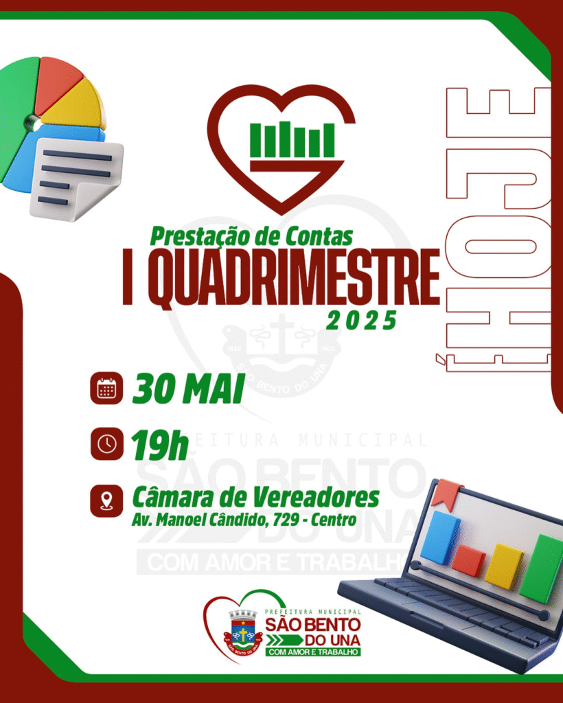 A Prefeitura de São Bento do Una tem a grata satisfação de convidar todos os munícipes para participarem da Audiência Pública de Prestação de Contas do Município, referente ao 1º quadrimestre do exercício financeiro de 2025, que acontecerá HOJE, a partir das 19h, na Casa Legislativa Irlando Galvão Cavalcante, (Câmara de Vereadores).