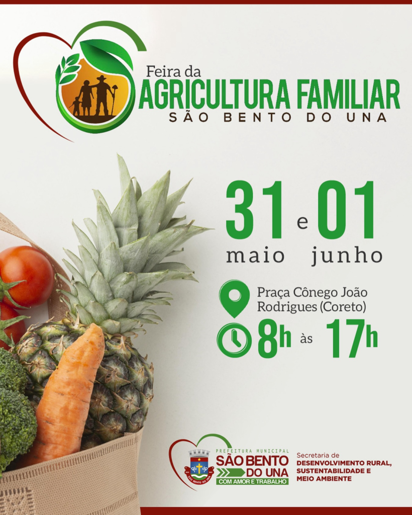 Pensando nisso, a Prefeitura de São Bento do Una, através da Secretaria de Desenvolvimento Rural, promoverá nos dias 31/05 e 01/06, na Praça Cônego João Rodrigues (“Praça do Coreto”), mais uma edição da “FEIRA DA AGRICULTURA FAMILIAR.”
