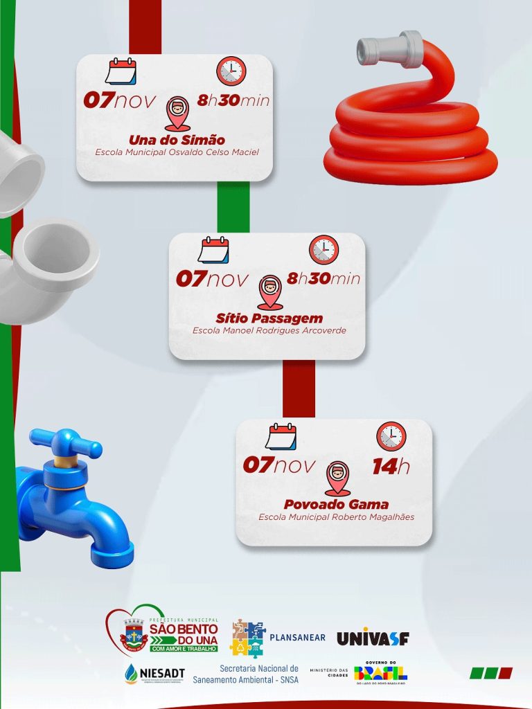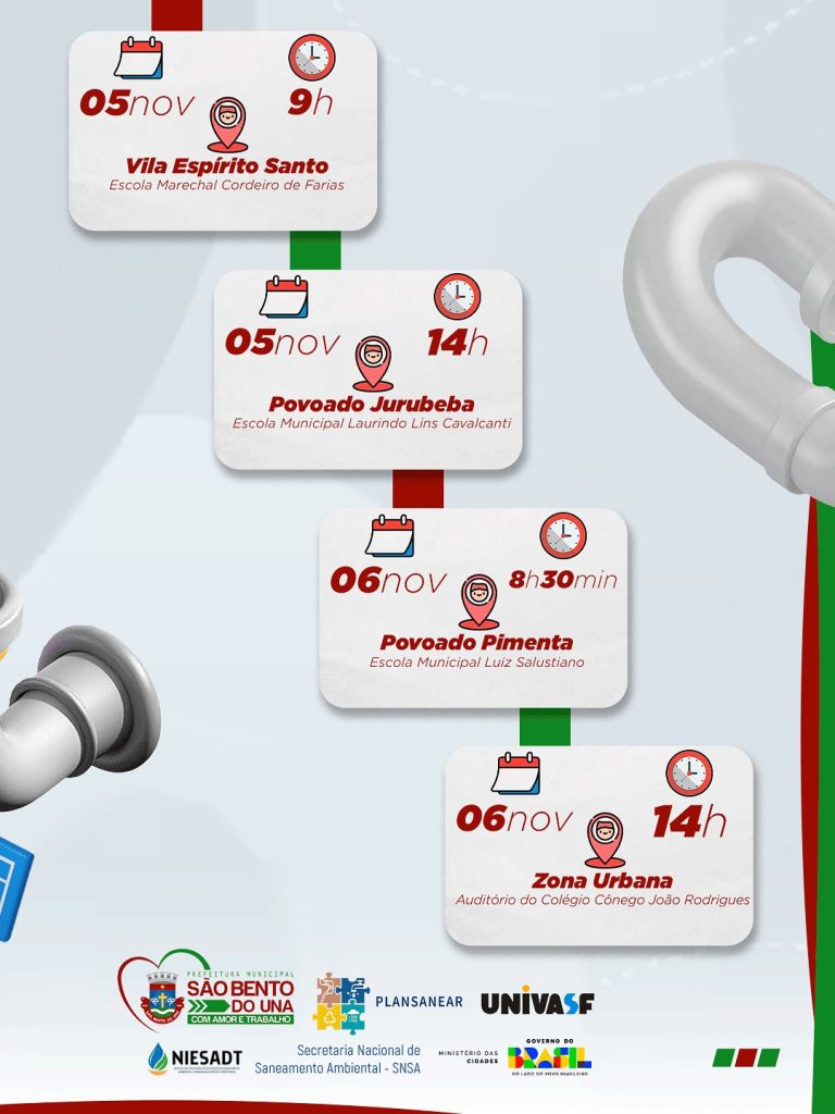 A Prefeitura de São Bento do Una, em parceria com o PLANSANEAR, convida toda a população para participar dos Eventos Públicos de construção do Plano Municipal de Saneamento Básico (PMSB).