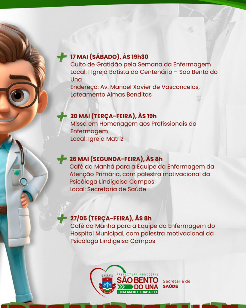💚Como forma de GRATIDÃO E RECONHECIMENTO à dedicação e compromisso de todos os PROFISSIONAIS DA EQUIPE DA ENFERMAGEM DO MUNICÍPIO, a Prefeitura de São Bento do Una promoverá a “Semana de Enfermagem”, cuja programação envolverá dinâmicas especiais que, certamente, irão alegrar e valorizar ainda mais esses servidores tão essenciais à saúde da população são-bentense!