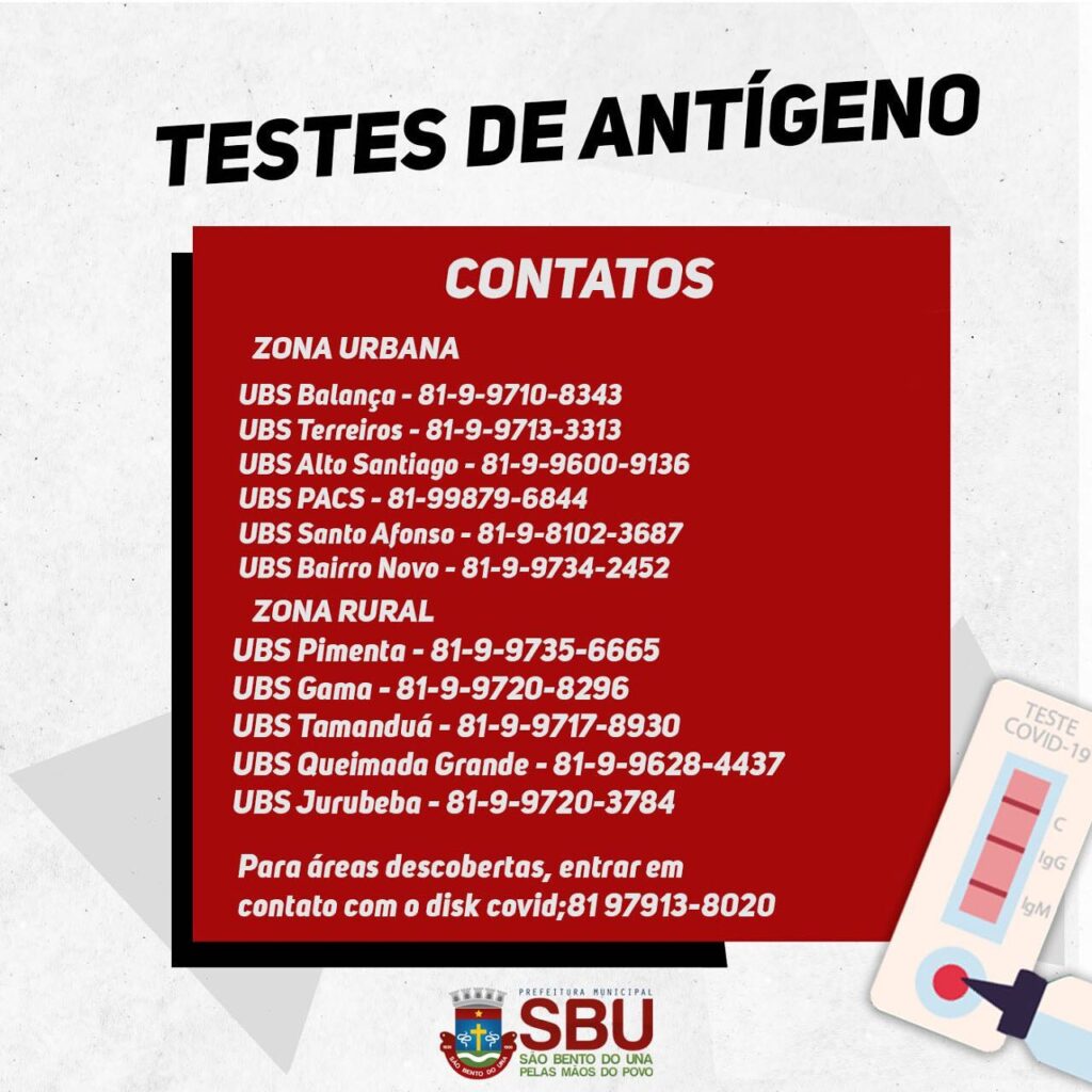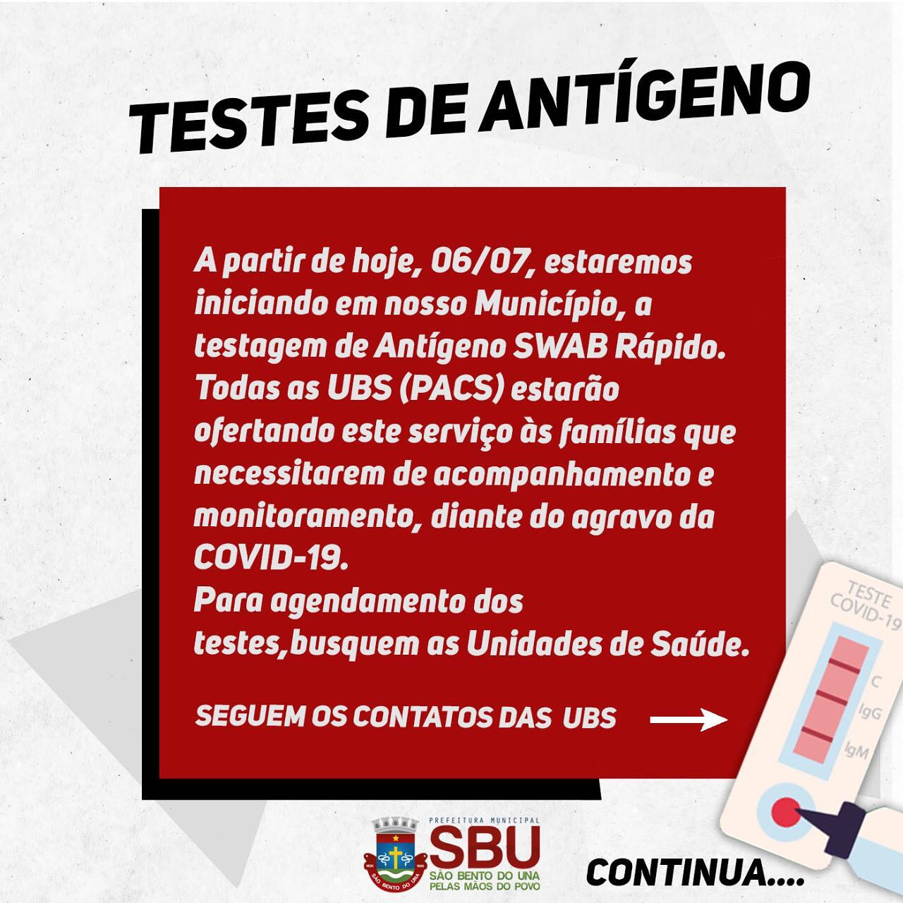 A partir de hoje, 06/07, estaremos iniciando em nosso Município, a testagem de Antígeno SWAB Rápido. Todas as UBS (PACS) estarão ofertando este serviço às famílias que necessitarem de acompanhamento e monitoramento, diante do agravamento da COVID-19.